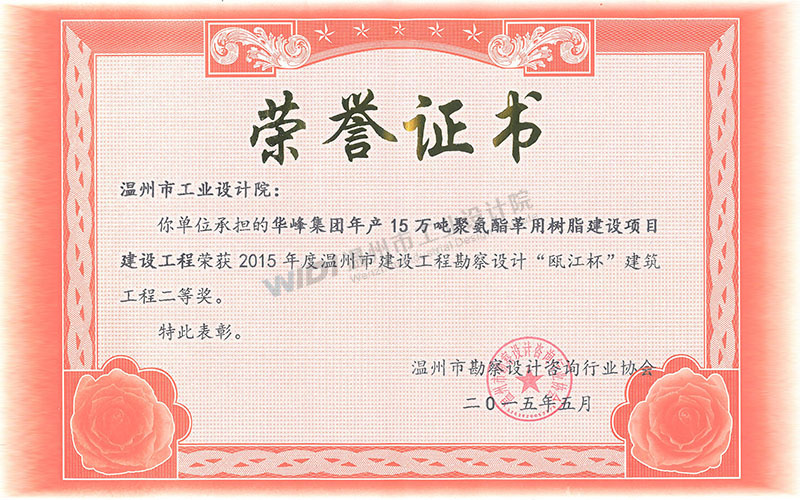 華峰集團(tuán)年產(chǎn)15萬噸聚氨酯革用樹脂建設(shè)項目建設(shè)工程 錢江杯表揚獎