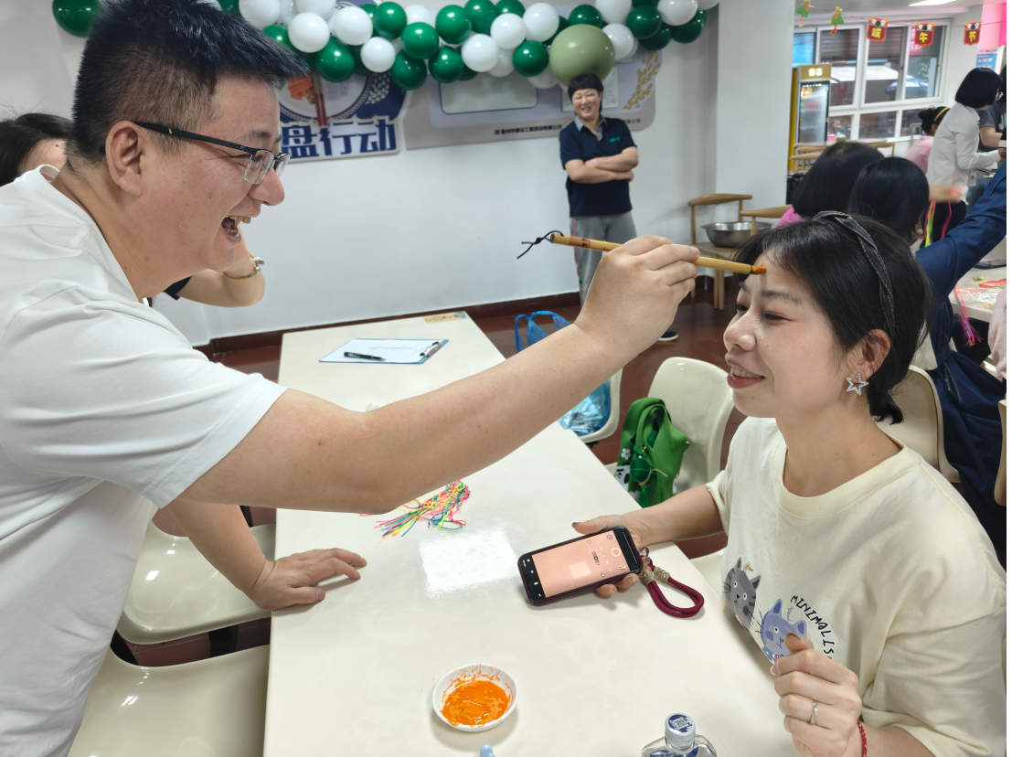 除了包粽子外,還組織了縫香包、編蛋袋、撞蛋、點(diǎn)額等形式多樣的活動(dòng)。其中點(diǎn)額儀式則是端午節(jié)活動(dòng)中的一項(xiàng)重要儀式。現(xiàn)場(chǎng)擺放著雄黃酒和艾草制品,大家將雄黃酒點(diǎn)在額頭、耳后、手腕等處,雄黃酒香氣四溢、艾草清香撲鼻,構(gòu)成了端午獨(dú)特的氣息,這不僅是對(duì)傳統(tǒng)文化的尊重與傳承,更是讓我們?cè)诂F(xiàn)代生活中仍感受到那份來自古代的智慧與關(guān)懷。